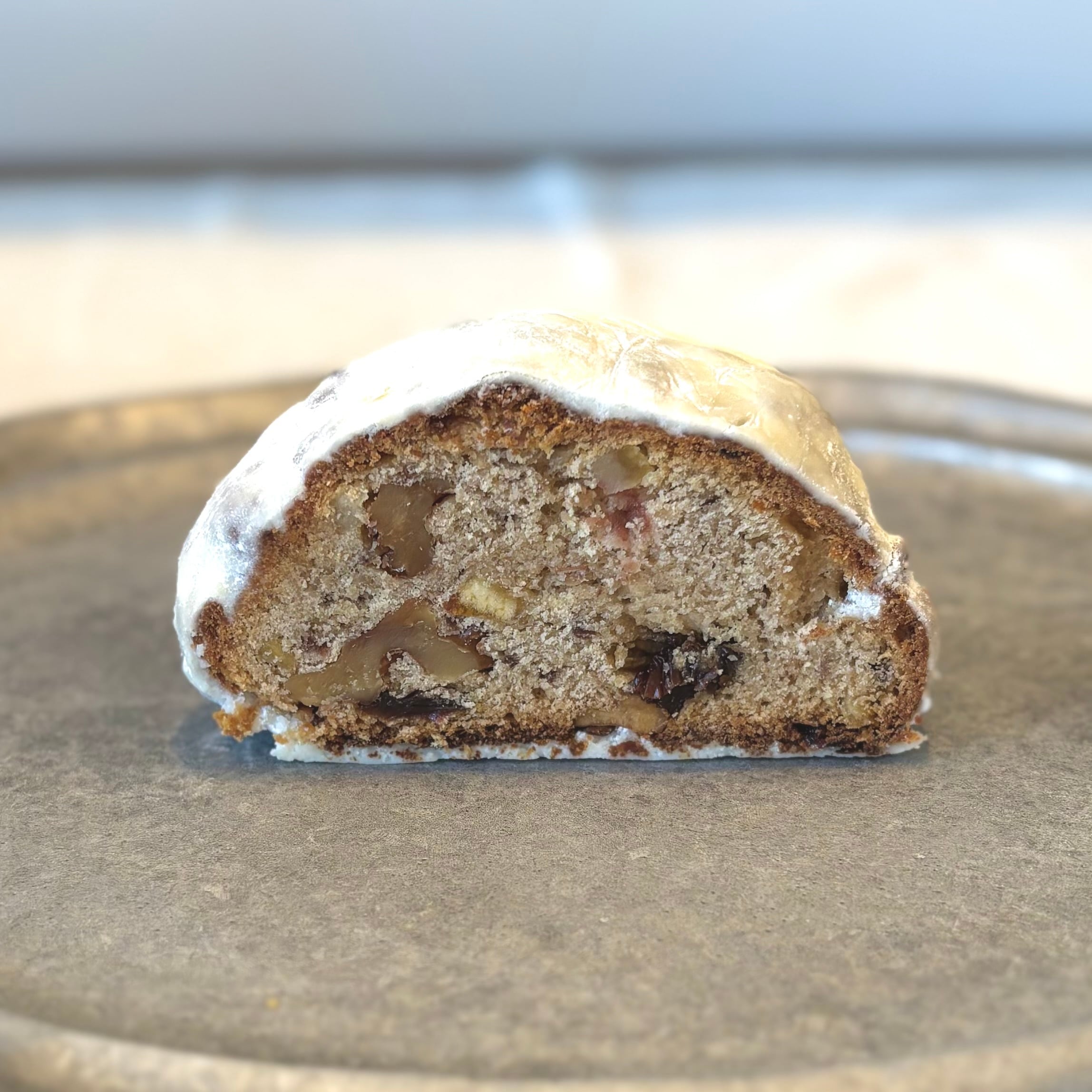 じっくりとラム酒に漬け込んだドライフルーツと、香ばしいナッツ、4種のスパイスを配合した、スタンダードなシュトーレン。